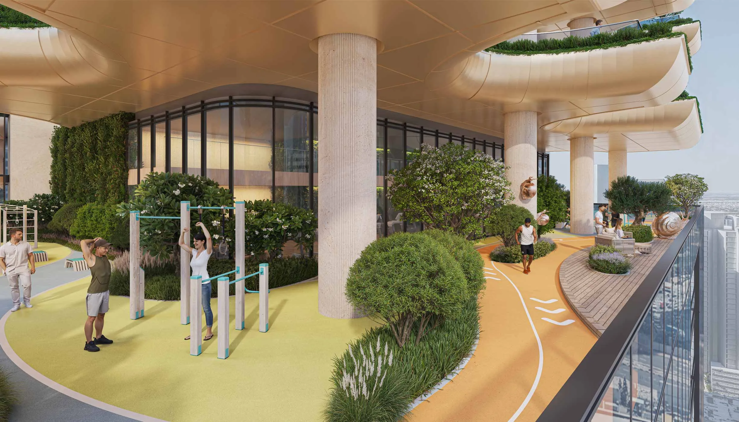 Curated Gardens & GreeneryEngage with nature through urban farming areas and landscaped spaces, creating tranquil pockets of greenery amidst the vertical living environment.